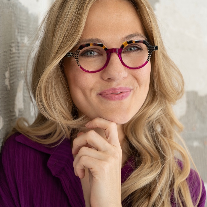 Vrouw met Marc O'Polo montuur, te koop bij Elzer Optiek